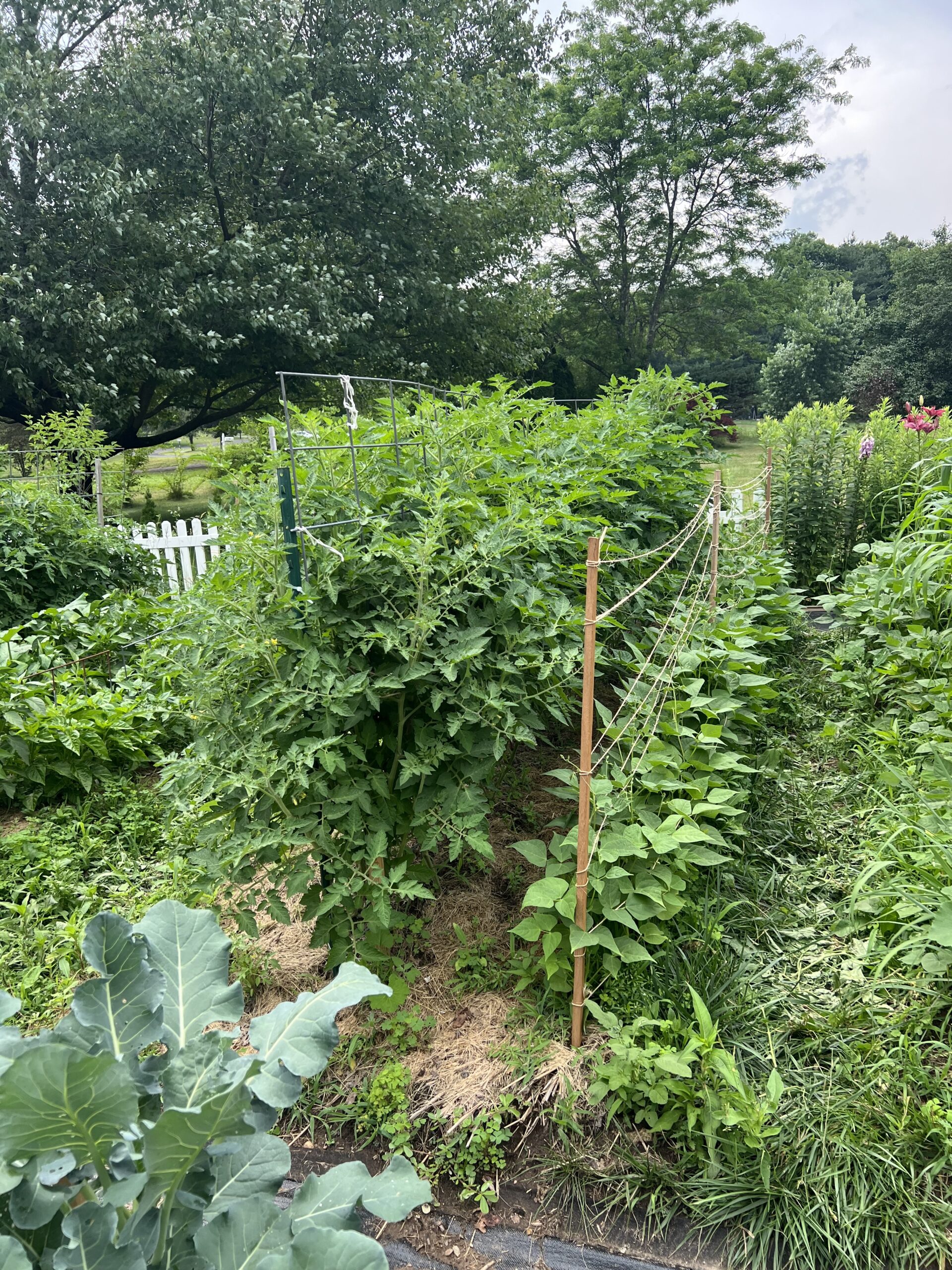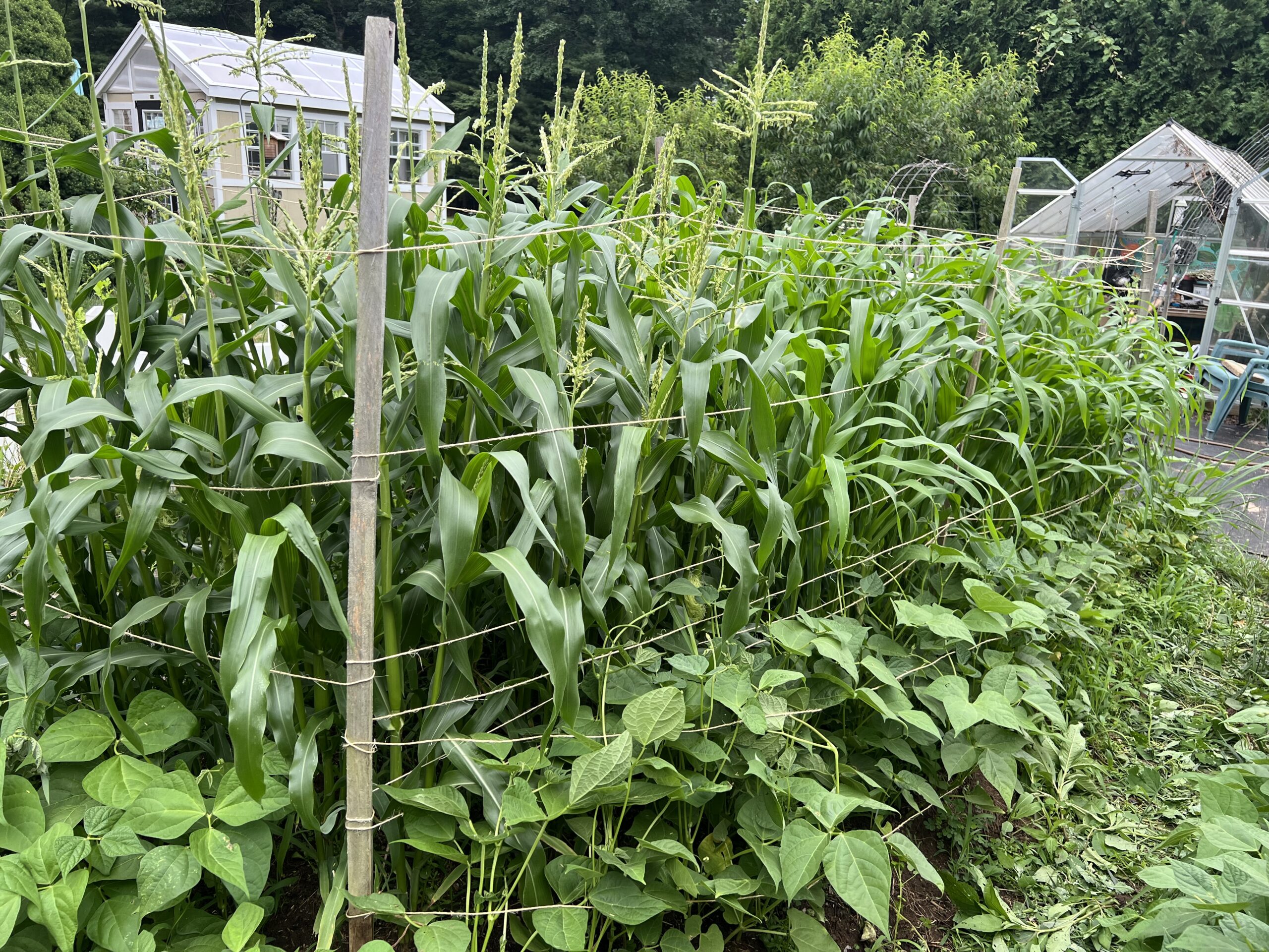 This is one that I am not sure I will end up with enough for a year supply. Corn can be challenging to grow. It is wind pollinated and susceptible to pests. I planted a 4 x 12 foot in-ground section of sweet corn. Unfortunately, a small section was already flattened either by heavy rain we had the other night or my dog sniffing out a critter. Not sure what happened, but I tried my best to straighten it back up and twine a barrier around it to protect it from future damage.